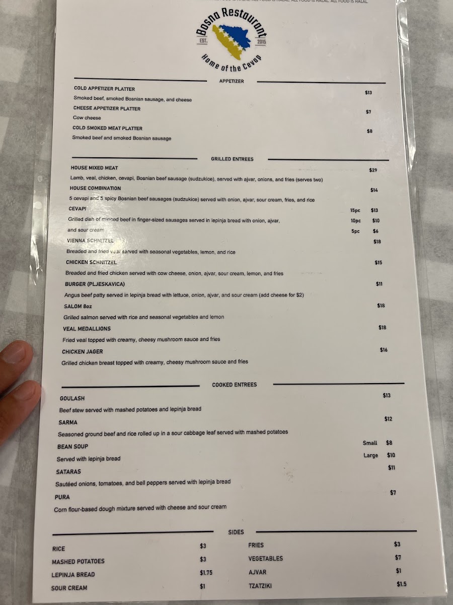 “ I strongly advice everyone to visit Bosna restaurant! Authentic Bosnian foods, burek, kofte and other delicios meals along with soups are very yummy! Big space, many tables to sit. Very clean restrooms. Clean and delicious food. Halal and Bosnian local food, lamb, chicken, meat options. ”